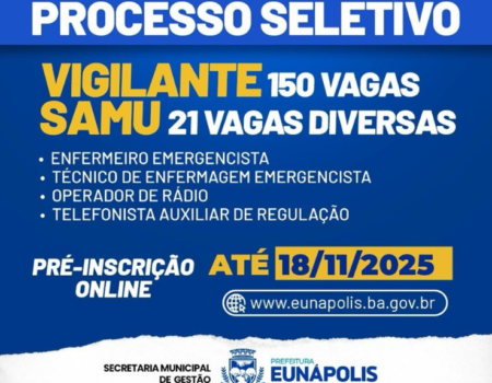 A Prefeitura de Eunápolis publicou, na terça-feira (2), o Edital dos Processos Seletivos...