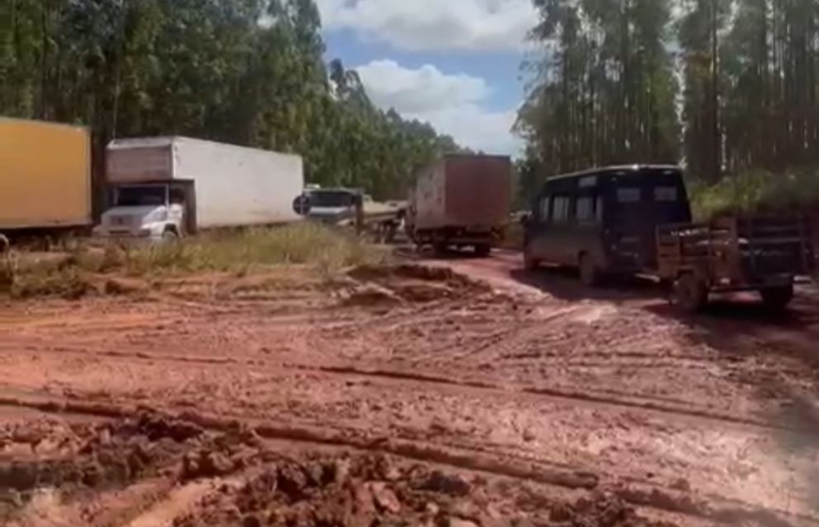 A situação é recorrente. Toda vez que chove, o trecho se torna um gargalo logístico, impactando o escoamento de cargas e o transporte de passageiros. A falta de estrutura e manutenção tem revoltado caminhoneiros, que denunciam o abandono da rota e pedem providências urgentes do governo do estado e da União.