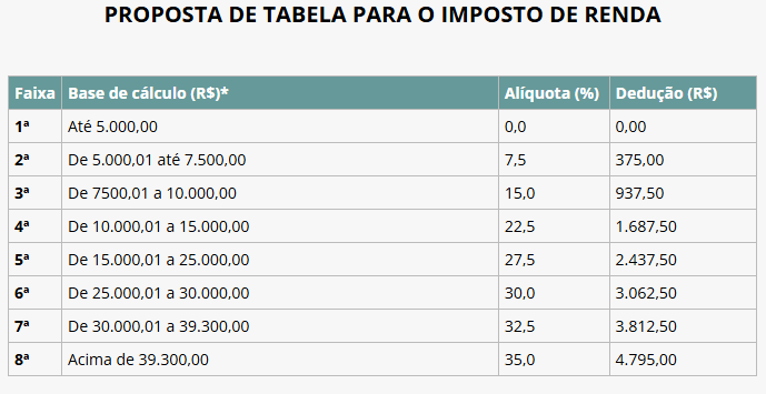 Os autores da proposta, deputados Sâmia Bomfim (Psol-SP), Fernanda Melchionna (Psol-RS) e Glauber Braga (Psol-RJ), explicam que a ideia é corrigir parte da defasagem na tabela, com isenção para pessoas físicas que ganham até R$ 5 mil e criar novas faixas que culminam em 35% para rendimentos acima de R$ 39,3 mil.
