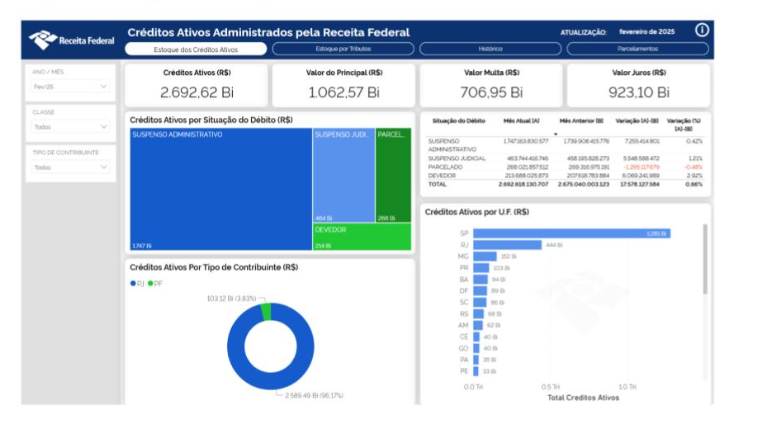 Em mais uma ação voltada à promoção da transparência ativa, a Receita Federal passou a disponibilizar em sua página na internet dois novos painéis interativos com informações detalhadas sobre créditos tributários ativos sob sua administração.