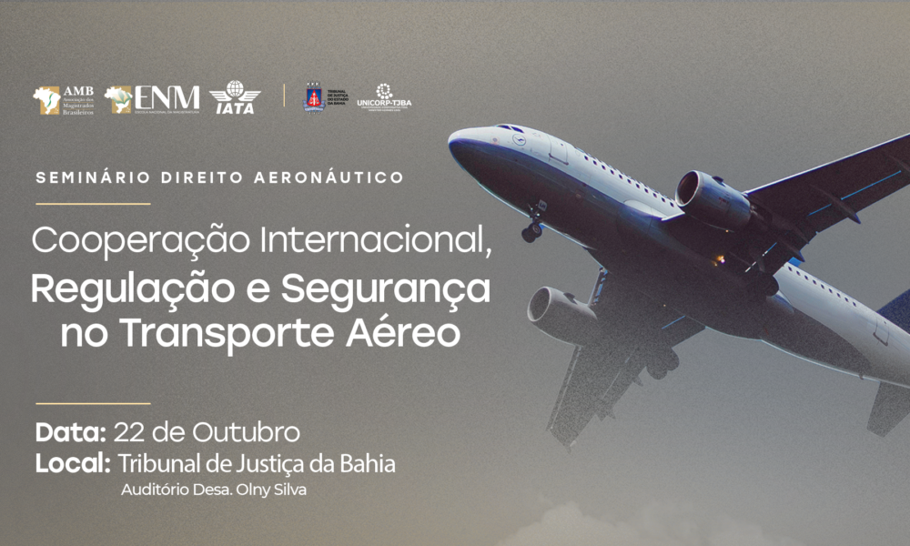Destinado a magistrados e servidores, bem como ao público em geral, o evento, que terá também transmissão ao vivo pelo canal do PJBA no YouTube, é uma realização conjunta da Associação dos Magistrados Brasileiros (AMB), da Escola Nacional da Magistratura (ENM) e da International Air Transport Association (IATA), com apoio do TJBA.