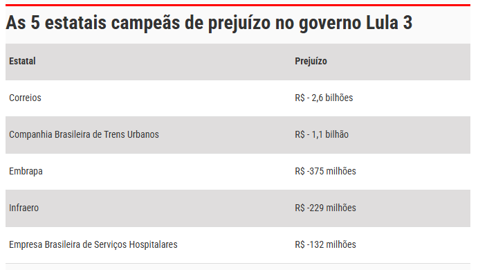 Na sequência aparecem a Embrapa (R$ -375 milhões), a Infraero (R$ -229 milhões) e a Empresa Brasileira de Serviços Hospitalares (R$ -132 milhões), completando a lista dos cinco piores resultados do ano.